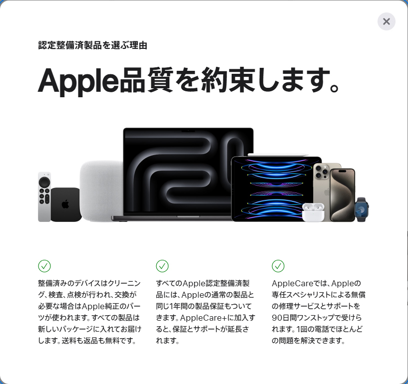 アップルのWebサイトより。アップルは自社で整備し保証を付けた「認定整備済製品」を販売しており、2023年からはiPhoneも日本で販売されるようになった
