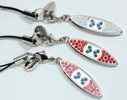 特製ストラップはゴールドプレーティング&ホログラム刻印仕様。オーストリア製のクリスタルガラスをあしらっており、こちらがそれぞれのキャラをイメージした配色になっている。また、タグの輝きを保持する電着塗装加工が施されている。