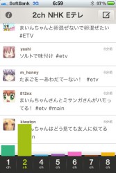 首都圏キー局7チャンネルについて、その局のハッシュタグを付けたつぶやきをピックアップ。つぶやきの数は「話題率グラフ」として表示され、リアルタイム(1分ごとに更新)で話題になっている番組を探すことができる。「tuneTV」からtwitterに投稿することも可能。今見ている局のハッシュタグもワンタッチでつけることができる。