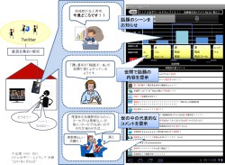 サーバー側でテレビ番組に関連するtwitterのつぶやき情報を収集・解析。「話題となっているキーワードの抽出」、「話題を表す代表的ツイートの抽出」、「話題となっているシーンの検出」を行う。抽出された情報はスマートフォンやタブレット、PCなどに表示し、番組の進行に合わせて楽しめる。話題シーンへのジャンプ再生やツイート閲覧なども直感的に操作可能だという。