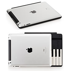 デザイン面では、iPadのケースにもなることが特徴。ケースとして使えるiPadはiPad 第2世代/第3世代/第4世代となる。プッシュボタンを押すことで、キーボードはフラットな状態から、飛び出す絵本のように白鍵と黒鍵がせり出してくる仕様を採用している。