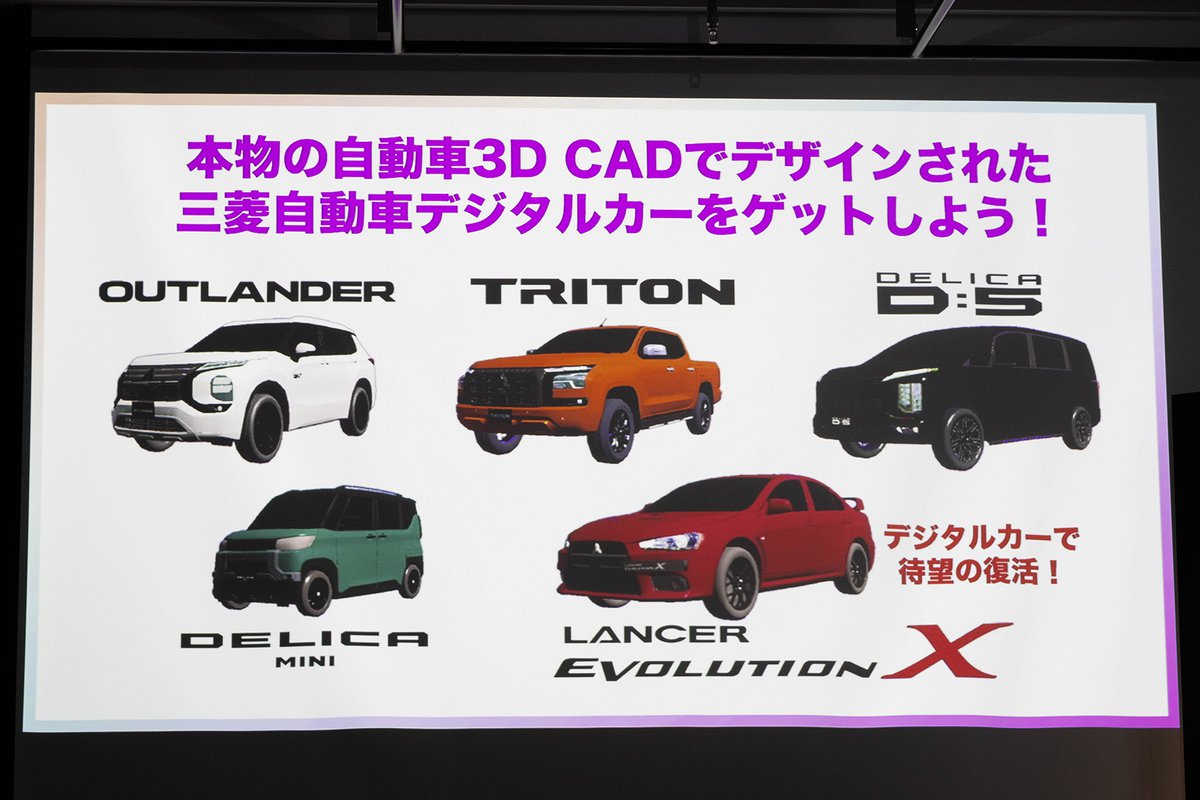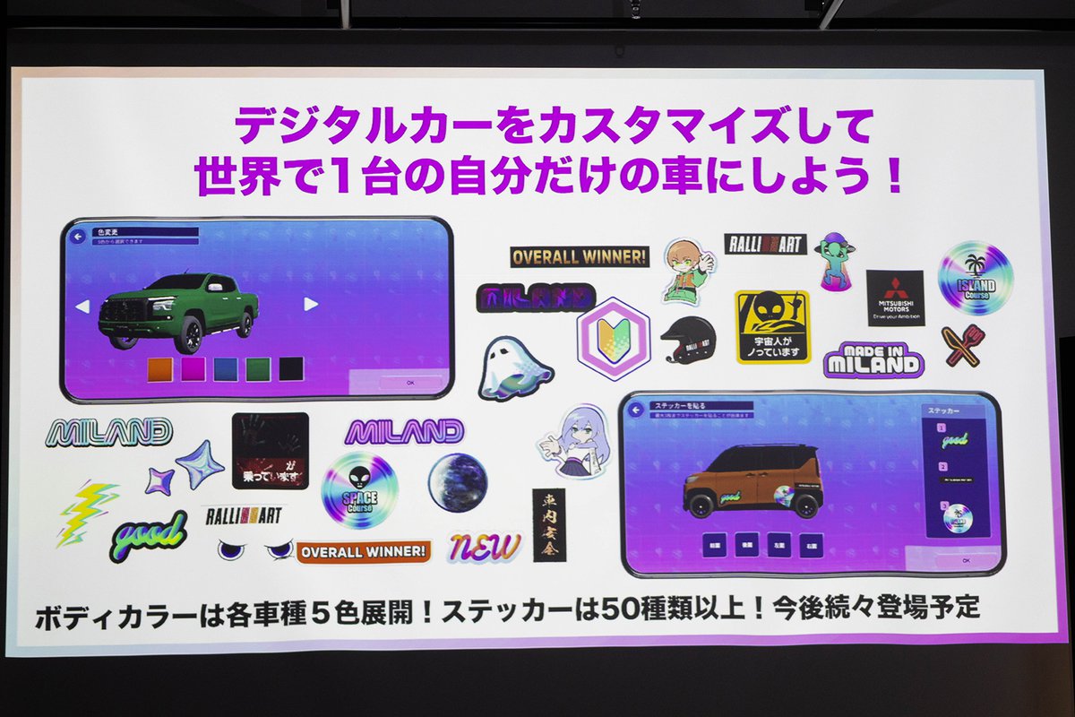 MILANDアプリでは、アバターと車をカスタマイズ可能。車は、三菱自動車のデリカミニ、デリカD:5、トライトン、アウトランダーという現行機種に加え、伝説の「ランサーエボリューション」もデジタル限定で復活する。本物の3D CADデータを使ってデザインされており、外観はもちろん内装もリアルにこだわって作られているという。