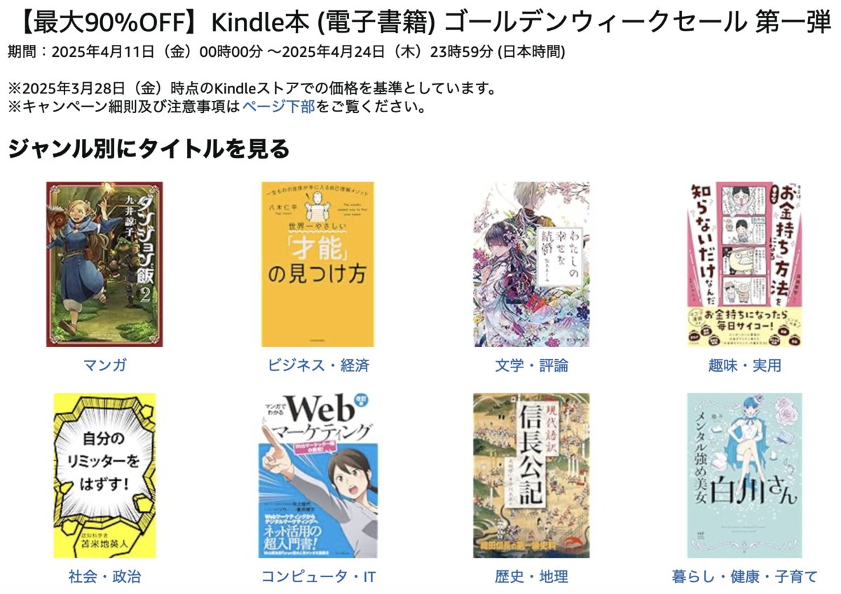 Amazonは、対象のKindle本が最大90%オフになる「Kindle本 ゴールデンウィークセール 第1弾」を本日4月11日 0時からスタートしている。期間は4月24日(木)23時59分まで。