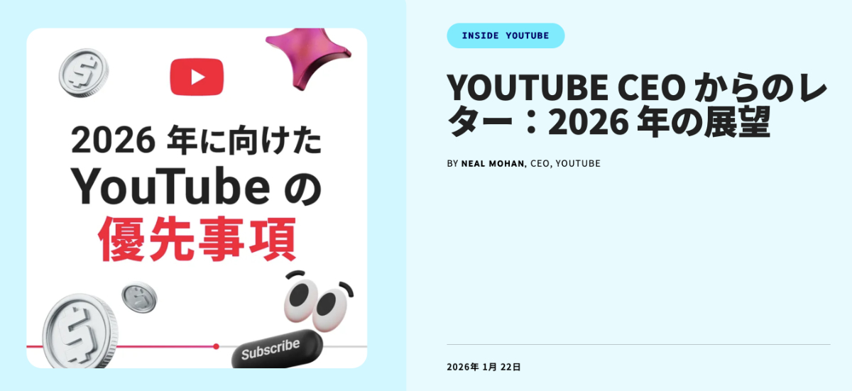 YouTubeのCEO、ニール・モーハン氏は1月22日付で「YOUTUBE CEO からのレター:2026年の展望」を公開し、2026年に向けた同社の注力領域を明らかにした。レターでは、創造性とテクノロジーの融合が進む中で、YouTubeが「文化の中心地」であり続けるために、クリエイターの成長を支える規模・コミュニティ・技術投資を強化していく方針を示している。