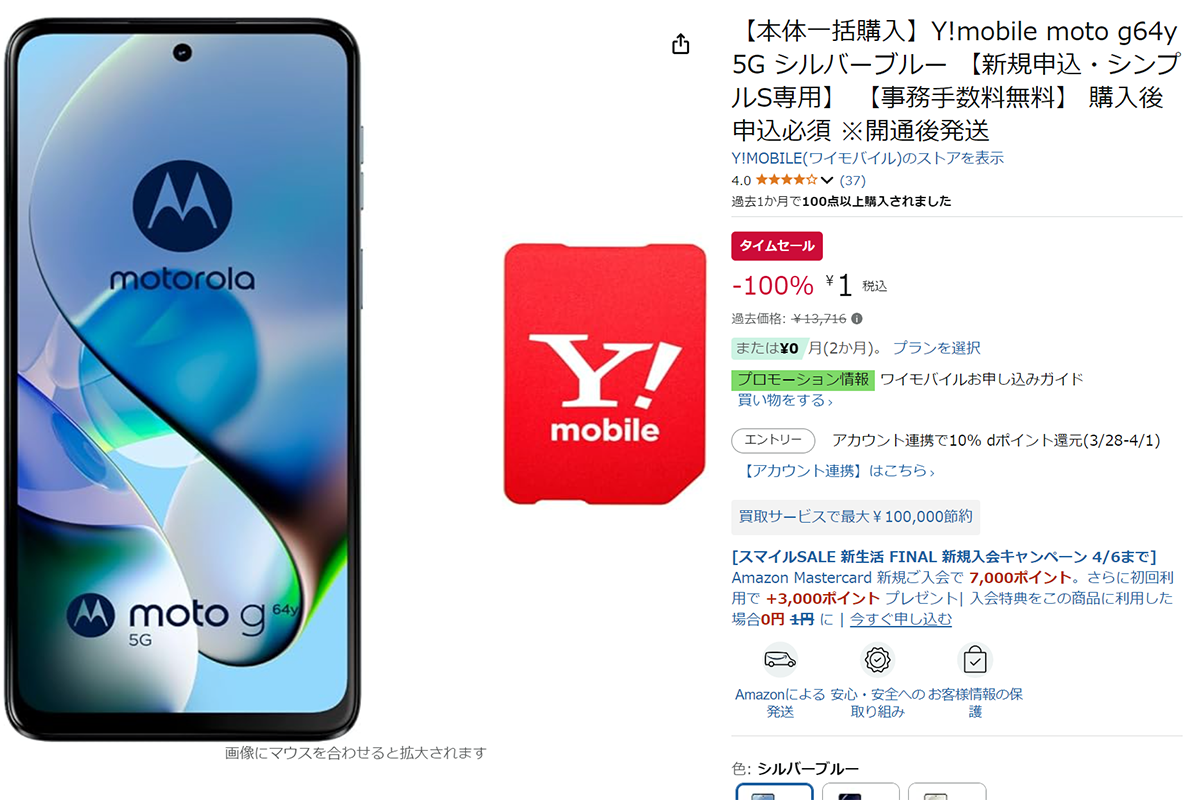 記事執筆時点で1円にて販売されているスマートフォンは、「Galaxy A25 5G」「moto g64y 5G」「nubia S 5G」「OPPO A3 5G」の4機種。1円購入の条件として、製品購入後にワイモバイル専用申し込みサイトを介した回線契約が必須となっている。専用申し込みサイトのURLは、購入後にAmazon.co.jpから送信されるメールに記載されており、契約が完了するとスマートフォンが発送される。