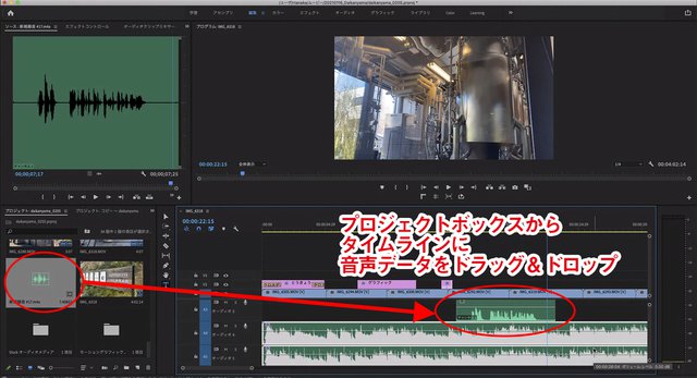 プロジェクトボックスから、タイムライン上に音声データをドラッグ&ドロップ。このときに、音楽データ(A4/A5)よりも上のレイヤー(A3)に音声データを配置することがポイント