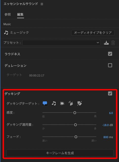 音楽の種類で「ミュージック」を選ぶと「ダッキング」という項目が現れる