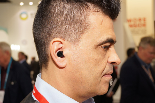 耳に装着したところ。側面がタッチセンサーになっている