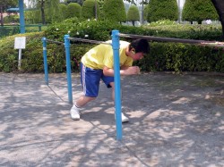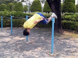 だが、この動きでもウォークマンは耳から外れない。Wシリーズのフィット性能はかなりのものだ。そこで、これまで上下、左右の両方向で試してきた装着テストに、“回転”という方向軸を加えるべく鉄棒にもチャレンジした。