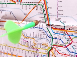 ロケ地選定に当たって用意したのは、東京近郊の電車路線図とダーツ。そう、ダーツで適当に目的地を選ぼうというわけだ。路線図は“東京近郊”とは言っても「80km圏」というシロモノで、熱海など取材が非常にツラくなる場所も含まれている。移動が大変にならないよう、なるべく東京の中心を狙って記者はダーツを投じるのだった。