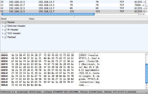 動画の再生を開始すると、Mac OS XとApple TVの間で(ピア・ツー・ピアで)ネゴシエーションが始まることがわかる。そのパケットのヘッダ部分を見ると、「HTTP/1.1..User-Agent: iTunes/10.1」とあることから、HTTPベースのストリーミング技術に基づいていると考えられる。