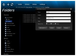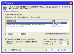 特定のドライブ/フォルダにあるコンテンツを公開する場合には、ライブラリボタンのメニューから「その他のオプション(O)...」を選択し、ライブラリタブにある「フォルダの監視(O)...」ボタンをクリックする。現れた「ライブラリに追加」画面で「詳細オプション(O)」ボタンをクリックし、任意のドライブ/フォルダを監視するフォルダとして追加すれば、以後DLNAサーバで公開されるようになる。