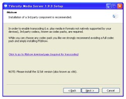 TVersityは、無償で利用できるトランスコード機能搭載のDLNAサーバだ。有償版(29.95ドル)もあるが、PS3との間でビデオ/オーディオを共有することだけが目的であれば、無償版でじゅうぶん用が足りる。インストール時にはいくつか質問されるが、ffdshow(DirectShowやVideo for Windowsに対応したコーデック集)をインストールすればいい。