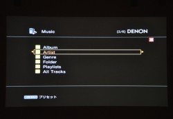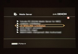 音楽ファイルをサーバーに移し終わったら、ネットワーク経由でAVアンプから再生してみる。AVR-3312の入力ソースを「NET/USB」に切り替えると、オンスクリーンメニュー、または本体ディスプレイに「Media Server」という項目が表示される。こちらを選択すると次の画面に、ネットワークにつないだNASの名前が表示されるのでこれを選択する。