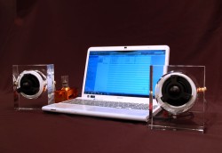個性溢れるデザイン性とカラフルなカラーリングというポイントからチョイスした組み合わせだ。透明度の高いガラスベースを用いたスピーカー、オーデリック「SP210」を中心に、アンプには手の平サイズのコンパクトなオレンジ色のアルミボディと真空管が目を惹くキャロットワン「ERNESTOLO」、PCとの間には赤い鮮烈なカラーリングのスマートな96kHz/24bit対応USB-DAC、HRT「MusicStreamer II」を接続した。