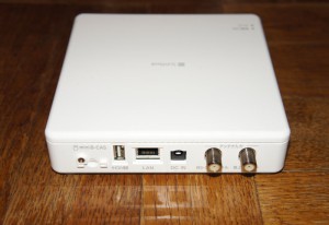 本体の背面にはmini B-CASカードスロットを装備。アンテナ入力端子は地上デジタルとBS/CSデジタルの2系統で、アンテナ出力端子は無い。このため、環境によっては分配器や分波器が必要になる。アンテナケーブルが1本付属するが、BS/CSデジタルも使用するなら、もう1本必要になる。