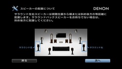 スピーカーを置く場所もチャンネルごとに指示してくれる。スピーカーケーブルの剥き方まで、簡単なアニメで表示される。センターやサラウンドバックの有無を確認してくれるので、システムに応じた変則的な設定にも対応できる。