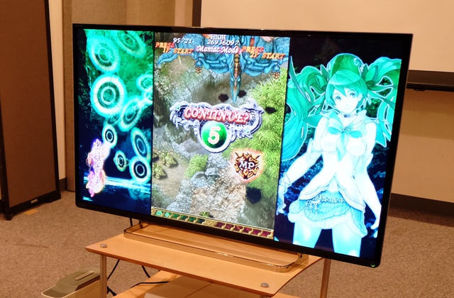これが大画面ではどうなるのか。まず結果として、さっき戦ったのは中ボスであり、大ボスが後ろに控えていたことが分かりました。しかも倒した! そう、2面に突入できたのです。