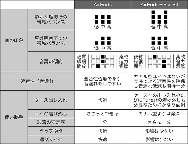というわけで「自宅→住宅地徒歩→電車車内→都心徒歩」というコースで、Purestを着けたり外したりしながら試聴した印象を一覧表にまとめたのがこちら↓