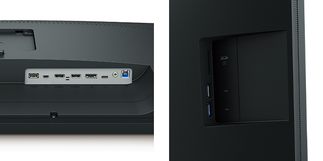 SW321Cのインタフェース部。底面(写真左)には、60W給電に対応したUSB Type-Cポートを搭載。モニターへの映像、音声出力はもちろん、接続したノートPCへの給電もケーブル1本で実現している。また、側面(写真右)にSDカードスロットを備えている点も見逃せないポイントだ