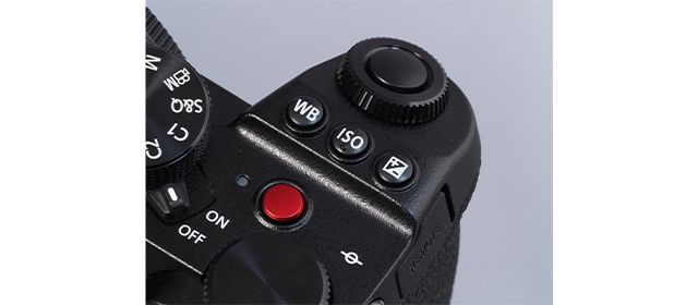 使用頻度の高い「ホワイトバランス」「ISO感度」「露出補正」の設定ボタンを、シャッター上部に並列配置。LUMIXの中級機以上に共通した馴染みのあるレイアウトだ