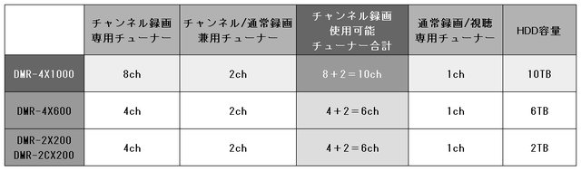 表の「チャンネル録画使用可能チューナー合計」が1日24時間録画を実行できるchの最大数。ハイエンドDMR-4X1000のみ10ch、他は6chとなっている。