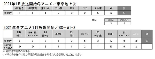 2021年1〜3月期新作をサンプルに、テレビ放送アニメの局ごとの放送作品数をまとめてみた。人力集計ミスもあるかもしれないが、どうせ毎期ごとに変わる数値なのでおおよその参考としていただければと思う。