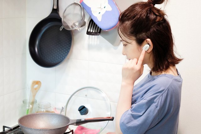 朝の仕事が一段落ついたらランチタイムだ。スマホにペアリングしたQC Earbudsを装着したまま過ごしていると、音楽を流しながらキッチンに立って料理、なんてこともこなせてしまう。テレワーク環境になって改めて気づいたのだが、自宅内のほとんどの行動範囲でBluetoothのワイヤレス接続は途切れないから、仕事用のデスクにスマホを置いたまま料理をしていても、QC Earbudsを使い続けられるのだ。