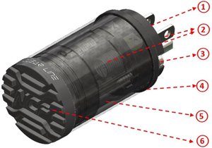 「NCF Clear Line」の構造図 (1)ボディ部:NCF調合ナイロン樹脂 (2)電極部とエアコイル:α純銅ロジウムメッキ導体/α-OCC単結晶銅導体エナメル線の外層に高性能シルバーカラー特殊制振塗料でコーティングしたエアコイル (3)自社特注の特殊な制振T10ステンレスネジとワッシャー (4)ハウジング:制振性の特殊ナイロン樹脂絶縁リングを組み込んだNCFに、外側を特注ハイブリッドNCFカーボンファイバー+特殊クリア硬質コート塗料で仕上げた4層構造 (5)密閉型の空気室:振動に対し内部の空気圧が抵抗となる (6)NCFエンドカバー:凹凸構造の立体設計でNCF素材の面積を平面構造よりも約76%アップ。NCFのタスク効率を向上