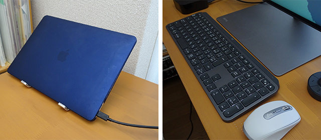 Apple M1チップを搭載した最新のMacBook Airをクラムシェルモードで接続。接続はThunderboltケーブル1本でスッキリ。MacBook Airに接続したBluetoothキーボードやマウスももちろん使用可能だ