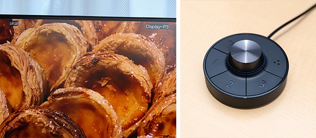 画面表示を中央から2つに分割し、それぞれを異なるカラーモードで表示できる「DualView」機能を搭載(写真左)。カラーモードは、独自のOSDコントローラー「ホットキーパック G2」でも素早く変更できる。またホットキーパック G2のボタン設定は好みに応じてカスタマイズすることも可能だ