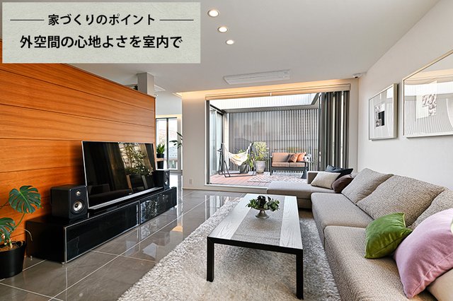 庭やテラスなどの屋外を室内のリビングとつなげたスペース「そらのま」があるリラックス空間です。家に居ながらも、アウトドアで遊ぶワクワクを感じられる間取りの好例です
