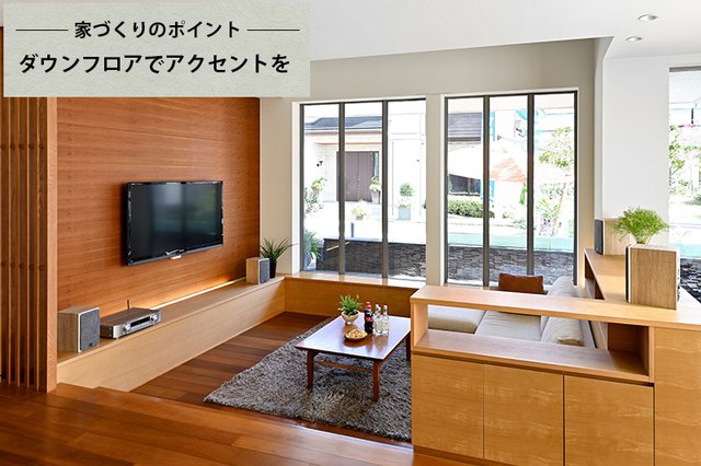 LDKは広い空間だからこそ、ダウンフロアにしてアクセントを付けるのがトレンド。リビングは「寛ぎの空間に入る」という気持ちのスイッチが入るのでお薦めです