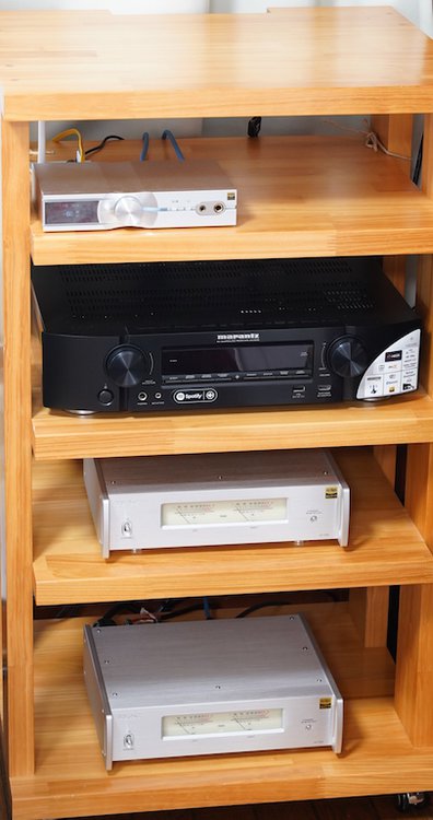 デスクトップで使用時に組み合わせ主な機材。TEACのパワーアンプ「AP-505」やマランツのAVレシーバー「NR1608」も使用する