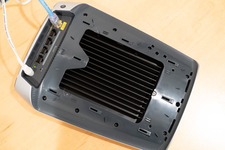 外形寸法は25.4×7.1×19.1cm、質量は1.3kgとやや大きめではあるが、逆にこれが信頼性へと繋がっているのだろう。ルーターは発熱の大きい機器の一つではあるが、近年多いコンパクトなタイプだと、放熱が追いつかず、熱による暴走やパフォーマンス低下の恐れもある。本機はパネルの奥に、家庭用では珍しい大型のヒートシンクが配置されており、かなり念入りに熱対策を行っているようだ。