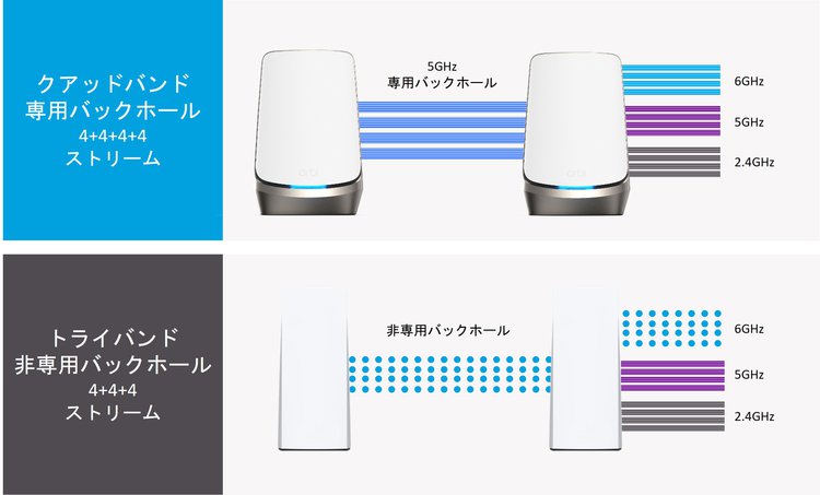 第3のポイントは、「クアッドバンド」と「専用バックホール」だ。メッシュWi-Fiルーターを選ぶときに、トライバンド対応が良いと聞いたことがある人が多いのではないだろうか。ちなみに○○バンドではなく、カウント方法を変えて同時ストリーム数と呼ばれることもある。