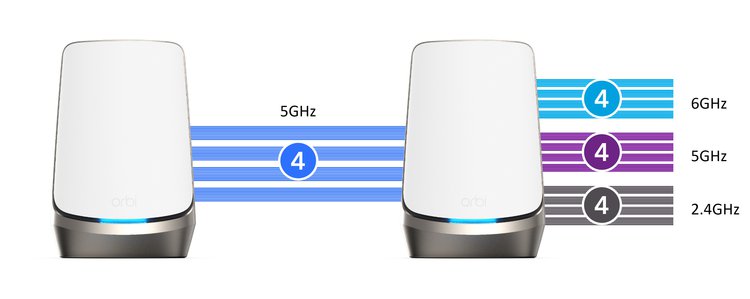 Orbi 9はクアッド、つまり4つのバンドを備えている。帯域の内訳としては、6GHz+5GHz+5GHz+2.4GHzだ。ストリーム数でカウントすると、それぞれ4ストリームのため、合計16ストリームとなる。