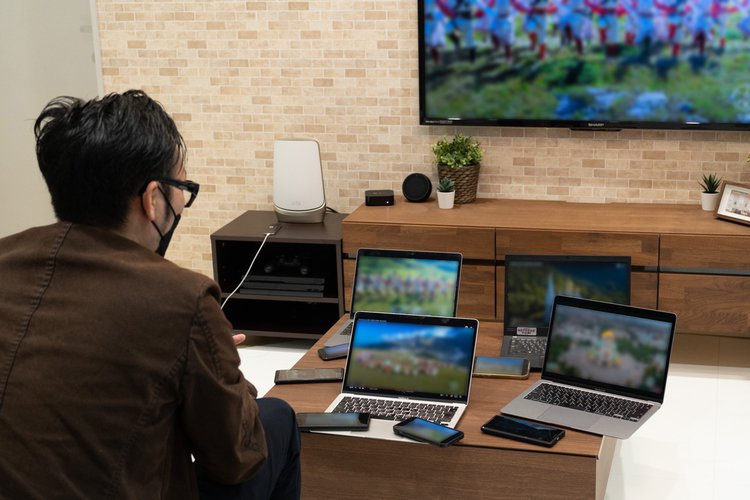 AVファン目線でこの超高速通信を活かしきる要素として考えられるのが、高画質の映像ストリーミングだろう。そこでショールームにあったApple TVに加えて、取材に立ち会った全員のノートPCやスマホをかき集めて、10台同時にYouTubeの4K動画を再生してみたのだが、このような高負荷でも映像が途切れる気配すらまったくなかった。