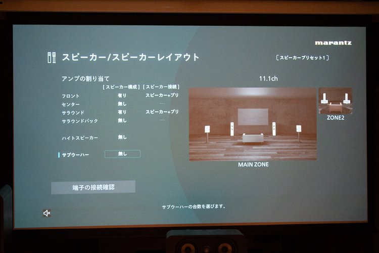 早速、スピーカー構成を5.1chまで一気にダウングレード。フロント/サラウンド/センターのスピーカーは残しつつ、トップスピーカーとサラウンドバックをオフにする。また、サブウーファーの「MXT12」についても、2つから1つに減らした(スピーカー合計額:379,500円/税込)。