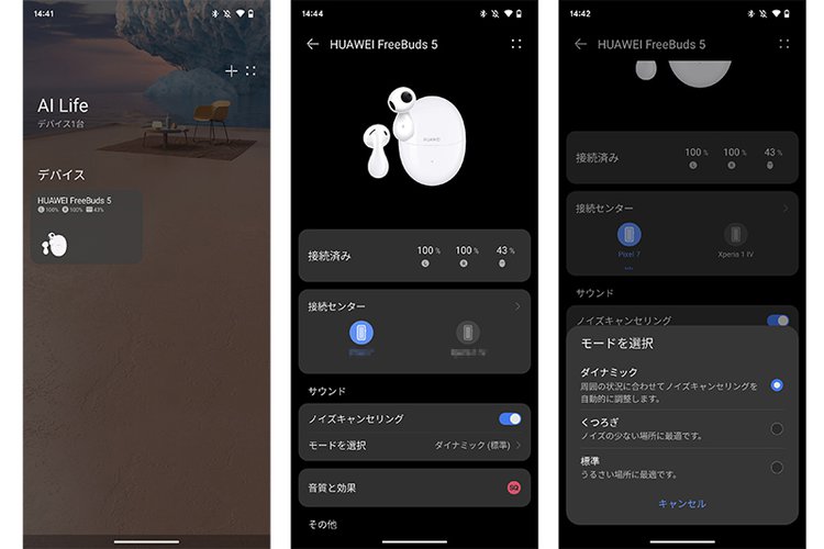 なお、ノイズキャンセリングの効果は、後述する「HUAWEI AI Lifeアプリ」で3つのモードを選択可能。このうち、「ダイナミック」に設定しておくと、騒音レベルに応じて自動的に、うるさい場所に効果的な「標準」と、比較的ノイズの少ない場所で快適な「くつろぎ」に切り替わる。