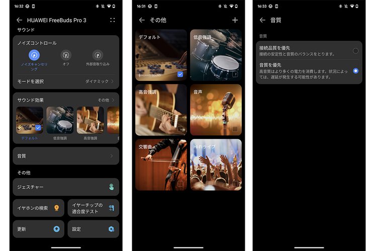 HUAWEI FreeBuds Pro 3では「トリプルアダプティブEQ」を搭載している。イヤホンの使用状況を複合的に検知して最適化を図るもので、音量レベル、外耳道の構造、装着の状態をリアルタイムで検出した補正に働く。最先端のEQ技術を、適応的にリアルタイムで働かせられる所は、HUAWEIのテック企業たる所以だ。