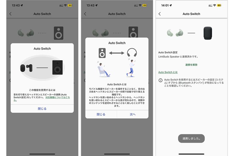 このように単体のBluetoothスピーカーとしても魅力的だが、前述のSound Connectアプリで「Auto Switch」の設定をしておくことで、対象イヤホンとの間で再生中の音楽をスムーズに受け渡せることが最大のポイント。