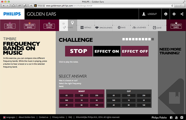ゴールデンイヤーのFREQUENCY BANDS ON MUSIC。再生される音楽の元と加工後を聴いて、9つの周波数帯のうちどれがブーストまたはカットされているかの18択×10問