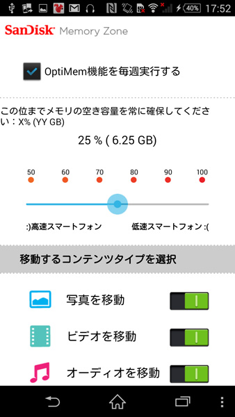 スマホの内蔵メモリーの空きをどれぐらい確保しておくか、転送するコンテンツの種類も決めながら自動転送機能もカスタマイズができる