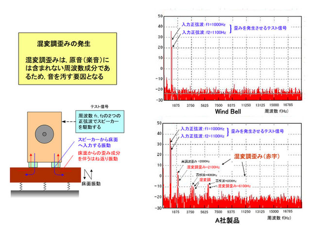 スピーカーの振動が床面に伝搬すると、その跳ね返り振動により、原音(楽音)には含まれない周波数成分である混変調歪みが発生し、音を汚す原因となる