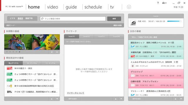 「PC TV with nasne」のメイン画面