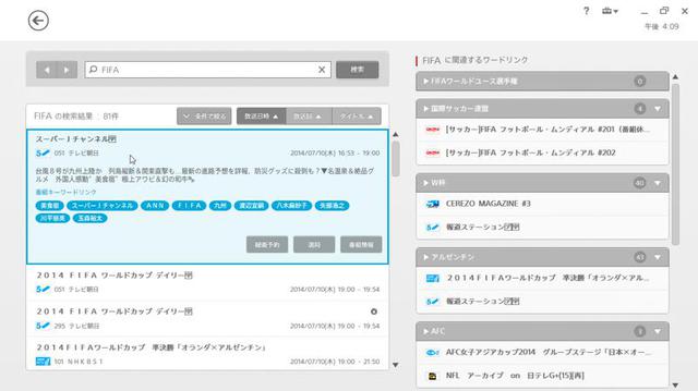 「テレビ番組の検索」の欄に文字を入力すると絞り込みと関連用語の自動ピックアップが行われる