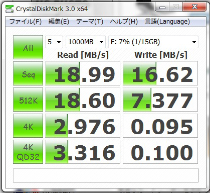 DELL製PC内蔵のカードリーダーの実効速度(計測:「Crystal Disk Mark」使用)。シーケンシャルリードで18.99MB/sにとどまる
