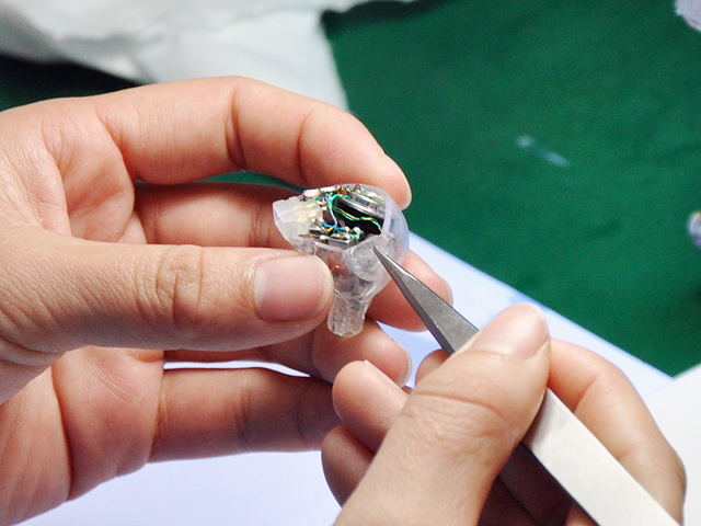 カスタムIEM制作の様子。シェルにドライバーを埋め込んでいるところ