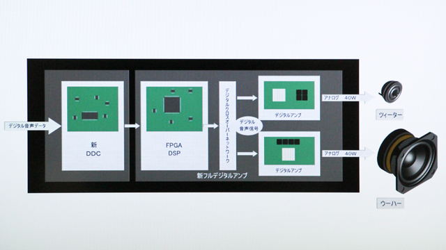 USB入力からアンプ部への回路イメージ。FPGAによるDSP、デジタルクロスオーバーネットワークを含む総合160Wのフルデジタルバイアンプを搭載する
